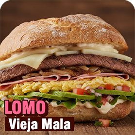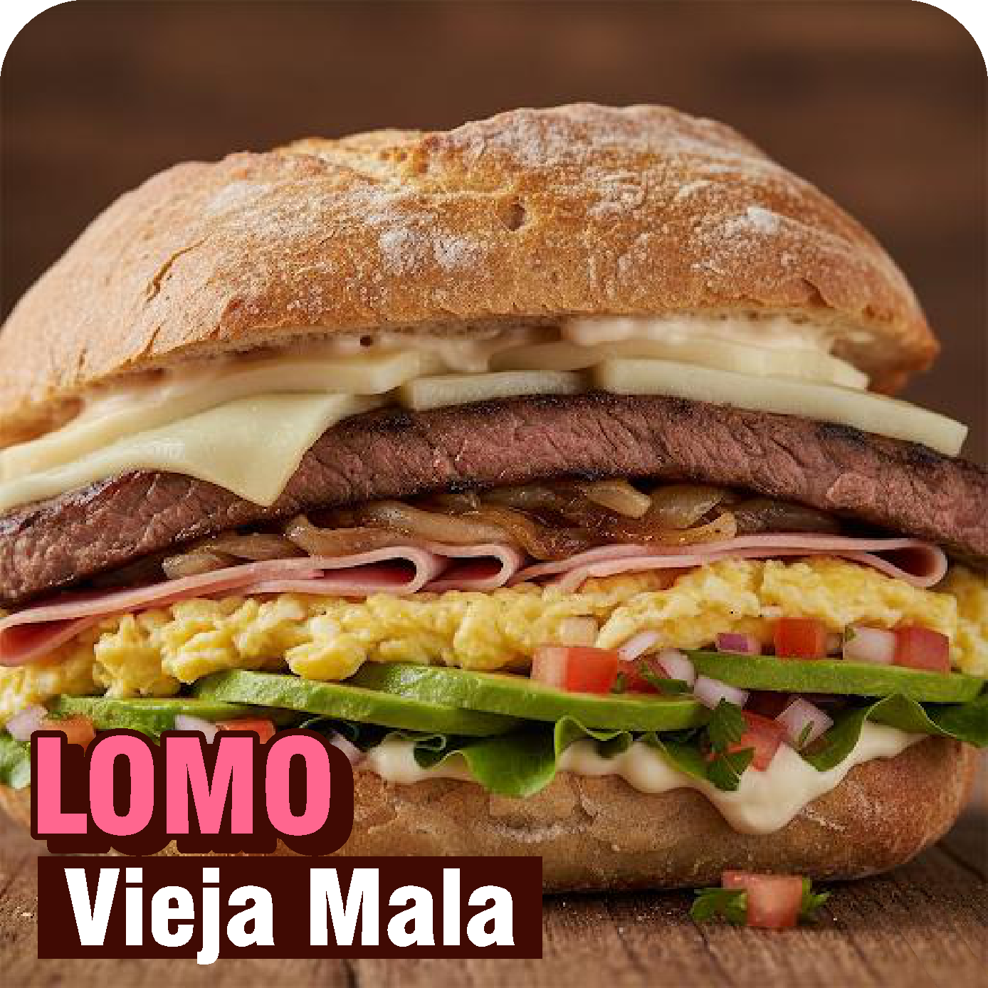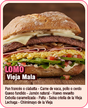 Pan francés o ciabatta - Carne de vaca, pollo o cerdo - Queso fundido - Jamón natural Huevo revuelto - Cebolla caramelizada Palta - Salsa criolla de la Vieja Lechuga - Chimimayo de la Vieja