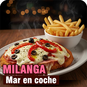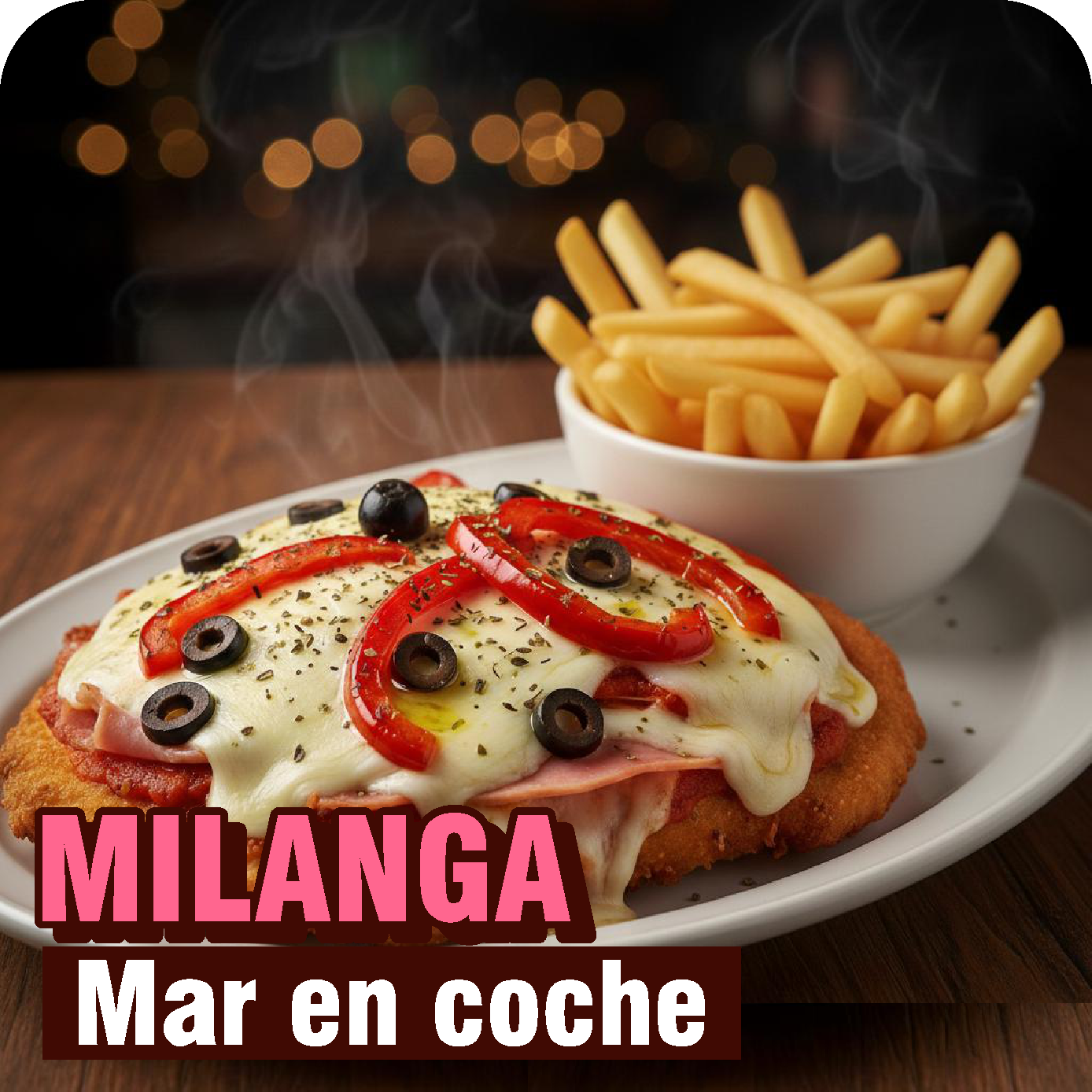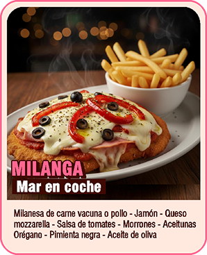 Milanesa de carne vacuna o pollo Jamón - Queso mozzarella Salsa de tomates - Morrones - Aceitunas Orégano - Pimienta negra - Aceite de oliva